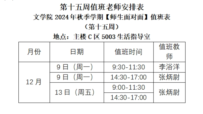 “师生面对面”是文学院学业辅导室和生活指导室联合推出的特别活动,每周不同时间段,文学院教师会在主楼C区5003值班,面对面与同学们交流,帮助同学们答疑解惑。