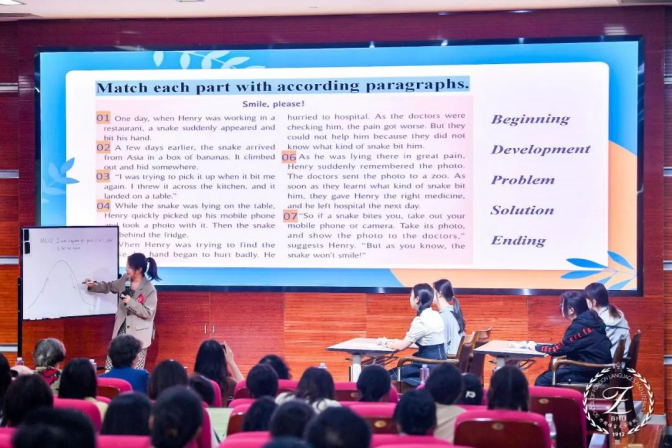 在展示环节中,选手们的教学仪态得体大方,课程设计逻辑清晰且引人入胜,他们或激情洋溢,或循循善诱,用生动的案例和深入浅出的讲解,将复杂的英语知识变得生动有趣,以饱满的热情和专业的素养,向观众和评委们展示了他们的教学风采,赢得了在场观众的阵阵掌声。本次决赛通过线上同步直播,汇聚了来自全国各地的教师及学生观众,线上观看人数达4000余人次。比赛过程中,观众们情绪高涨,积极参与互动,与选手和评委们共同营造了一个热烈而富有活力的交流氛围。