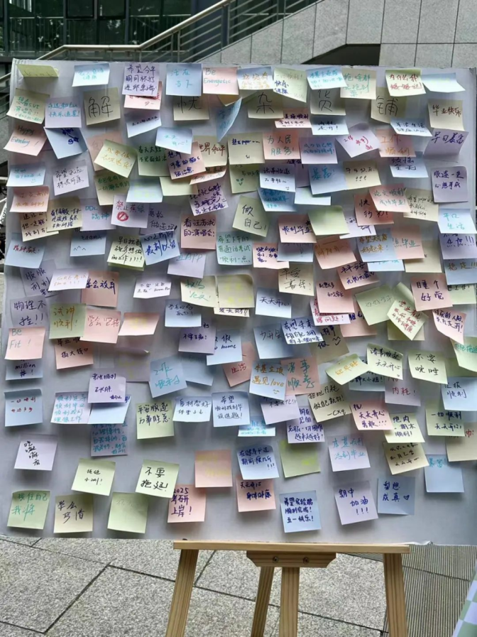 "解忧杂货铺"为同学们提供了一处心灵的庇护所。在这里,同学们可以将心中的忧愁和困扰倾诉于五彩的卡片,让它们在展板上绽放成一片温暖的留言花海。通过彼此的关怀和鼓励,他们在共鸣中找到了慰藉,共同织起了一张张情感的网。