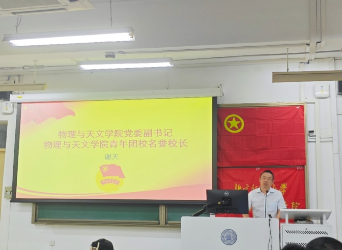 随后,物理与天文学院党委副书记、物理与天文学院青年团校名誉校长谢天老师率先致辞,向报名青年团校的同学们表示衷心的祝贺与欢迎。谢老师强调了物理与天文学院第一届青年团校的意义,并向同学们传达了勤奋学习,积极进取,坚定理想信念的价值观,鼓励同学们在青年团校中绽放青春光彩。