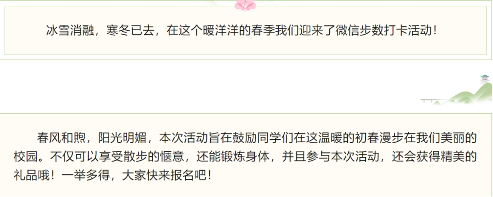 冰雪消融,寒冬已去,在这个暖洋洋的春季我们迎来了微信步数打卡活动!