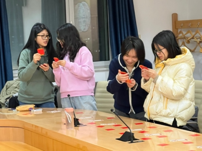 在猜灯谜环节中,加入了分组对抗元素,同学们先自行组队,随后对桌上的灯谜进行“争夺”,猜对最多的组可以优先选择春联大礼包。