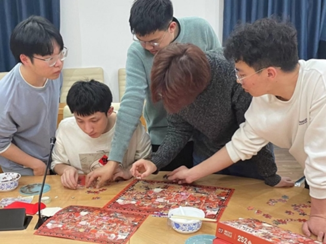 在拼拼图环节中,同学们通力合作,搭边框,拼内饰,不一会儿一张精美的年画便跃然桌上。