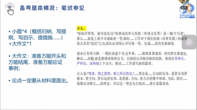 接下来是笔试申论部分,在大作文的备考中,师姐建议大家准备一个“万能开头”和“万能结尾”,以及一些比较灵活的论证事例。师姐强调,大作文中的论点不是我们自己天马行空去想的,而是根据材料所给内容提炼出来的。