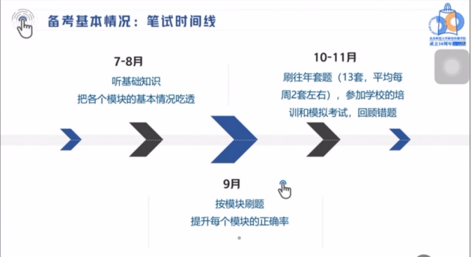 随后师姐分享了自己准备笔试时的时间线以供大家参考。师姐建议在7到8月的时候掌握好各个板块的基础知识;9月的时候按模块刷题,逐个击破,提升每个模块的正确率;10月到11月可以尽量卡时间刷套题,逐渐找到考场上的感觉。