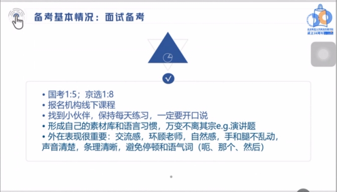 最后,师姐就面试备考给出了一些建议,最重要的一点是一定要开口说,锻炼自己在很短时间内构建答案整体逻辑的能力。另外要和老师形成一种交流感,做到声音清楚、条理清晰,身体不乱晃动,减少停顿和语气词的使用。