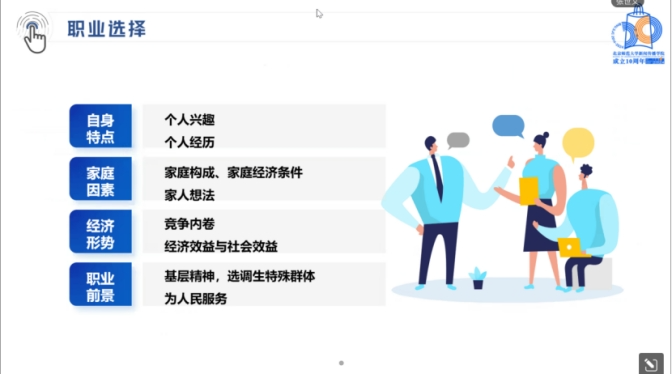 接下来师兄就职业选择给出了一些建议。师兄提醒大家,选择选调考试一定要考虑到自身特点、家庭因素、经济形势和职业前景这四个关键要素。