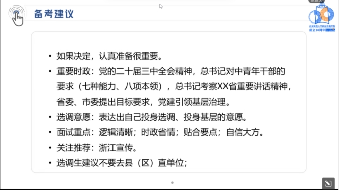 最后,师兄就选调备考给出了一些建议。首先,如果决定要参加选调考试,就一定要认真准备。其次,要关注每年的时政热点,这些都是真题的重要来源。最后,在面试中一定要自信大方,敢于展现自己,同时也要逻辑清晰,把控好答题时间。