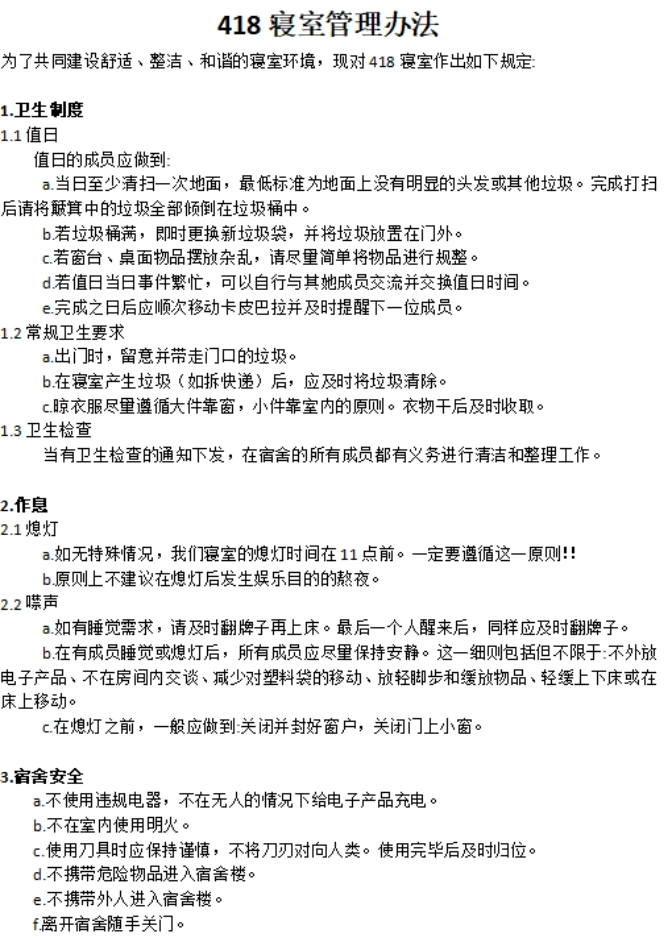 学11楼418宿舍的公约条理清晰,考虑全面,对宿舍纪律、宿舍安全注意事项、生活作息和其他方面做出明确要求,体现出寝室成员对自身的高要求,值得我们点赞。