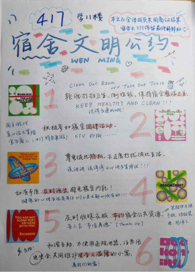 417宿舍选择纸质版手绘的形式,将严肃的寝室规定以活泼可爱的方式呈现出来,让寝室成员在认真执行各项要求的同时能保持好心情。