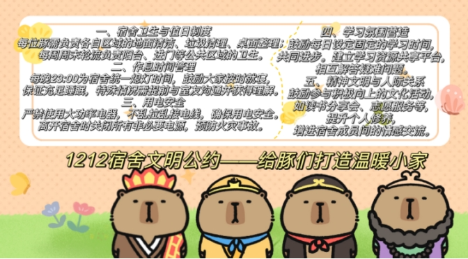 1212寝室选择西游记版卡皮巴拉形象作为公约配图,生动有趣,别出心裁;在内容方面,该寝室特意强调了“学习氛围营造”,能看出寝室成员之间相互督促共同进步的心愿。