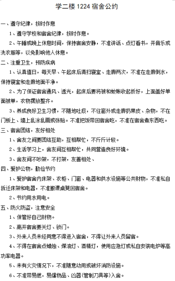1224寝室将寝室公约细分为五大块,条理清楚,内容细致全面。寝室成员共同强调了要注重卫生,并且细心列举了多条操作性强的内务规范,表达出成员对待寝室生活的认真态度。