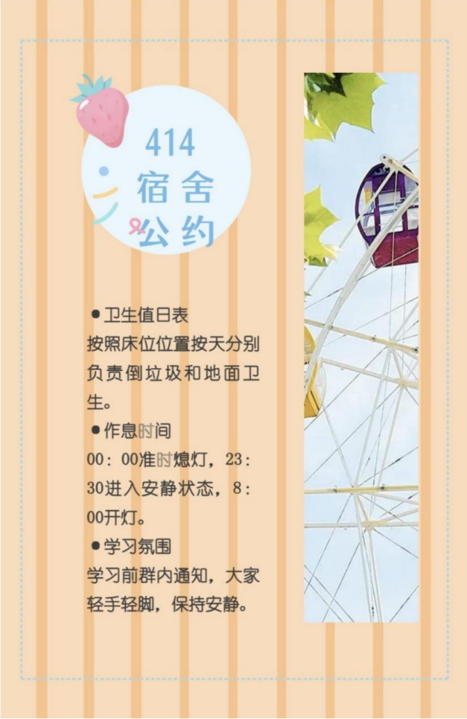 414宿舍公约简洁明了,言简意赅,让人能够迅速get到她们宿舍公约关注的核心点。同时,橙黄色的公约背景,也让人能从中看出寝室成员之间关系的温暖。