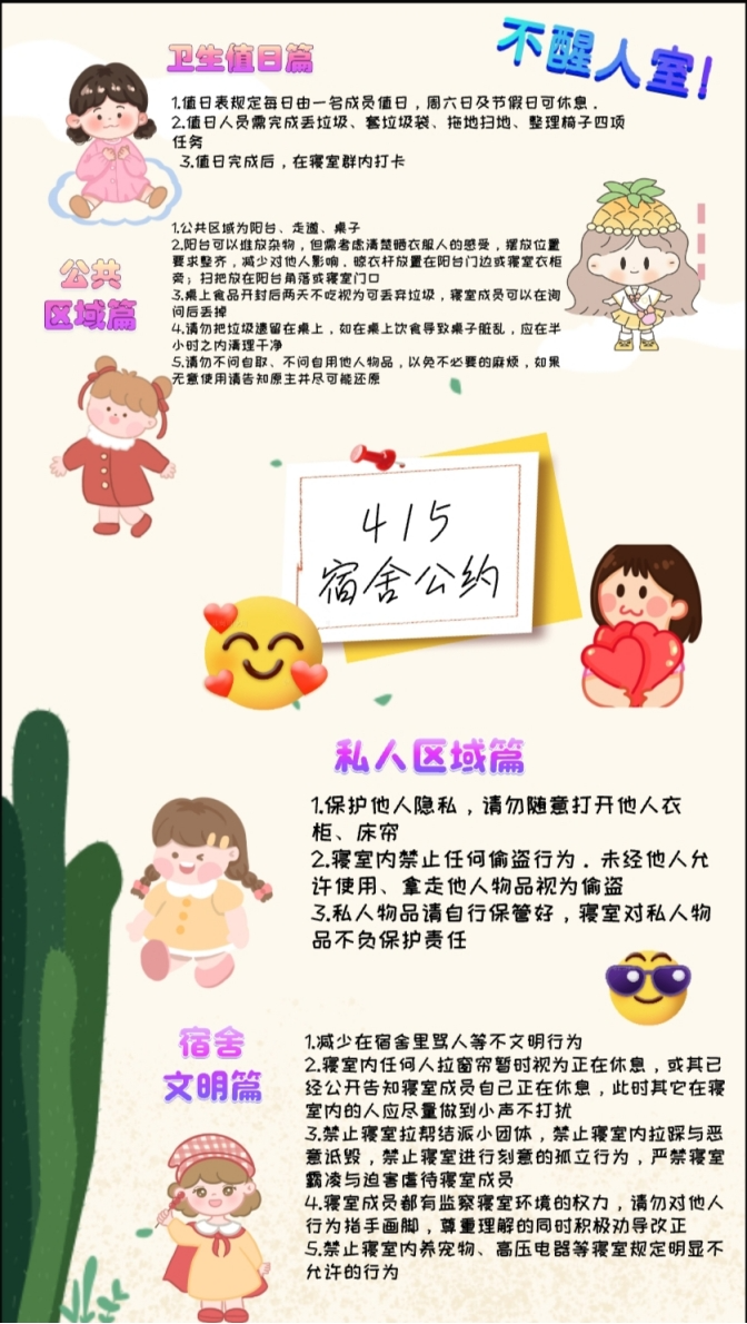 415寝室公约内容详细丰富,全面具体,特意将私人区域注意事项单列出来,可以看出成员在爱护关心集体的同时,也十分注重个人权益保护。