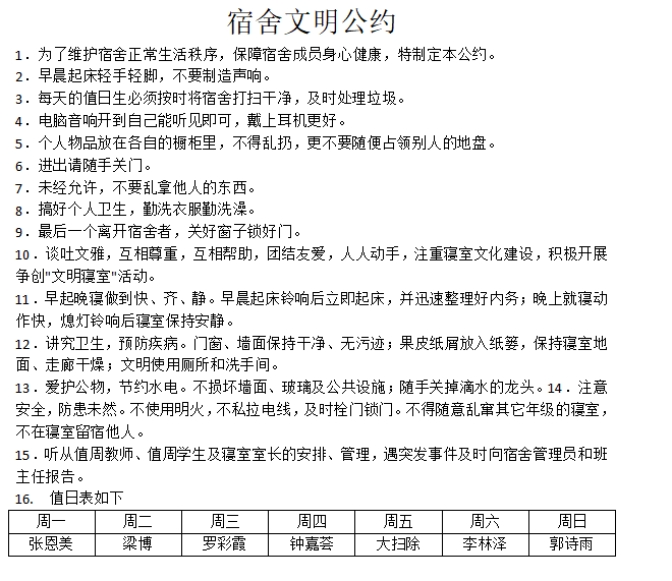 420宿舍文明公约共有16条,涵盖了寝室生活需要注意的方方面面,并细心的列出了值日表,在每周五安排了固定时间的大扫除,相信这个寝室一定是一个讲卫生守纪律的文明宿舍。
