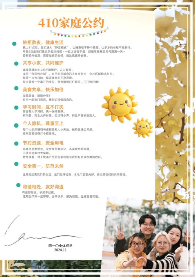 410寝室将寝规命名为家庭公约,可以看出团结友好,温暖友爱的寝室氛围。相信410寝室的成员一定能和谐相处,以积极阳光的态度对待生活。