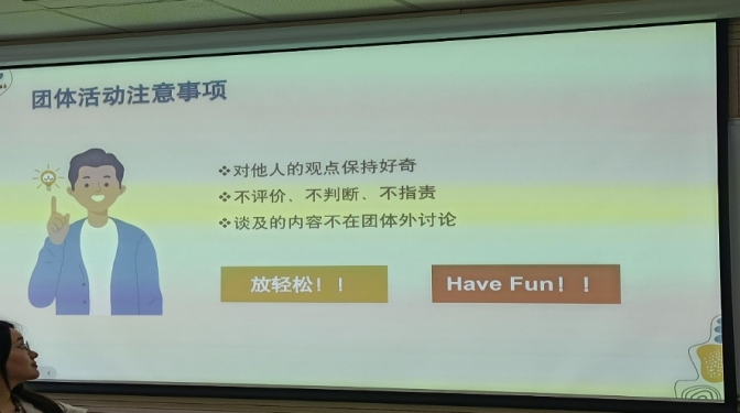 在活动初始,高老师以亲切的自我介绍为活动拉开了序幕,简短而真挚的话语瞬间营造了温馨的氛围。随后,为了保证团辅活动有序进行,高老师对团辅活动注意事项进行了强调,提醒同学们要对他人的观点保持好奇,做到不评价、不判断、不指责,谈及内容不在团体外讨论,营造了一个更加开放包容、和谐舒适的团体氛围。