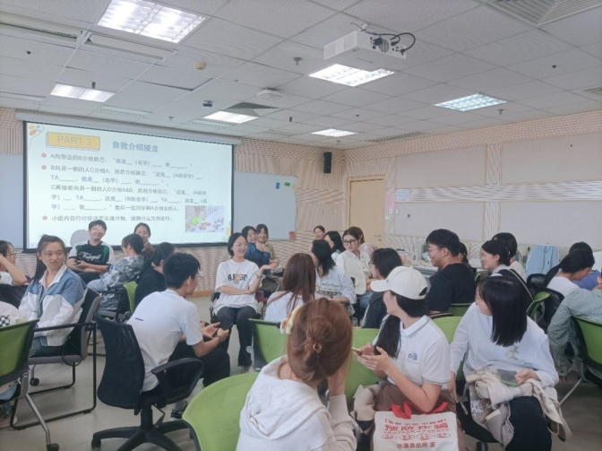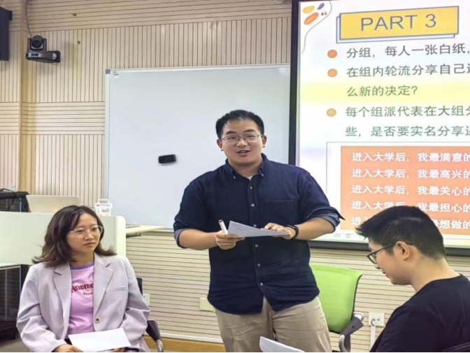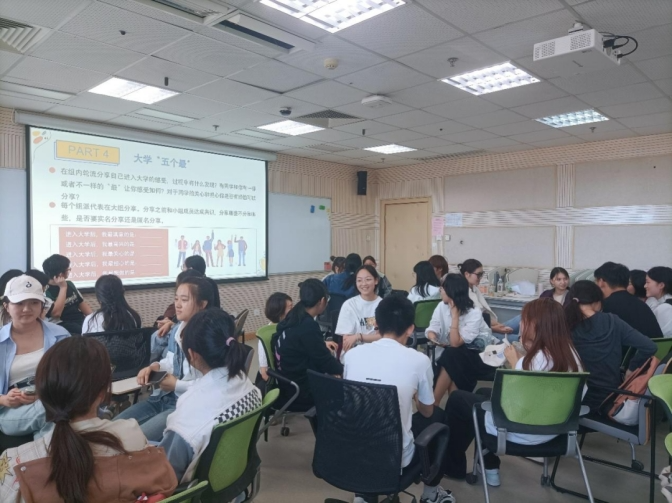 破冰游戏结束后,新生们进入了“走进彼此”环节。通过“自我介绍接龙”“大学‘五个最’”等环节,大家分享了自己的兴趣爱好、进入大学的感受以及对未来大学生活的期待和担忧。