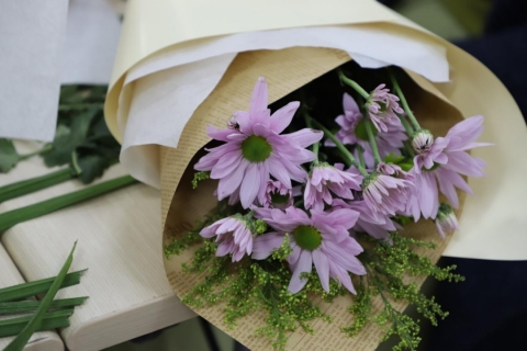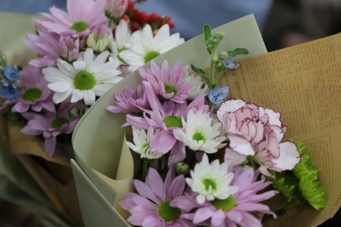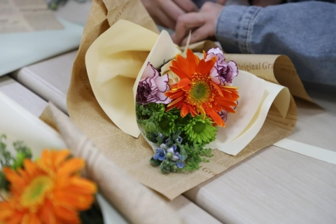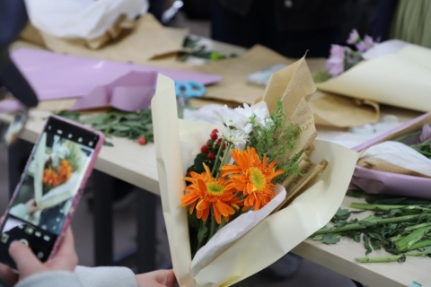 经过灵感的迸发与精心的制作,同学们纷纷完成了属于自己的作品。一束束精美的花艺作品摆放在展示台上,承载着同学们的奇思妙想,散发着明亮的春日气息。大家纷纷围观欣赏,拍照留念。
