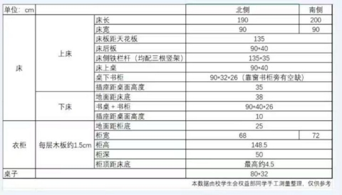 女生宿舍:本科生的宿舍一般为六人间,暖气、空调一应俱全。每个床位有两个插座,床头自带双层架子;如果幸运的话,你还可以拥有一个小阳台。寝室的具体数据为表格显示,买东西的时候可以做一个参考。