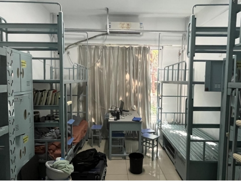 研究生的宿舍一般为四人间,暖气、空调一应俱全。每个床位下面都有一张学习桌,学习桌的墙面上三到四个插头,学习桌自带架子,可以用于放置书本等;并且学习桌旁边有专门放置衣服杂物等物品的柜子。