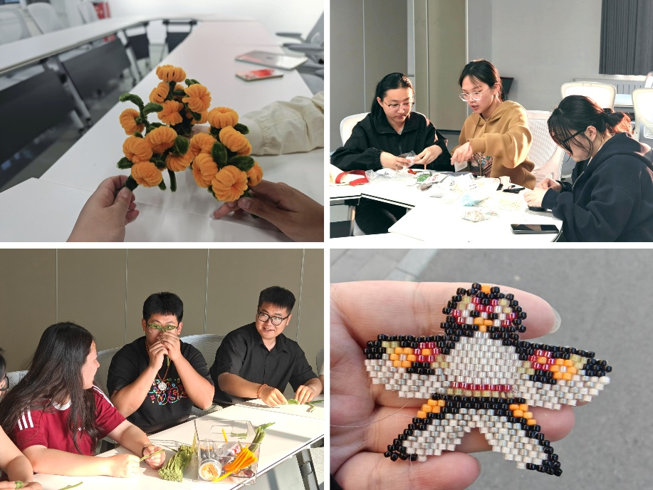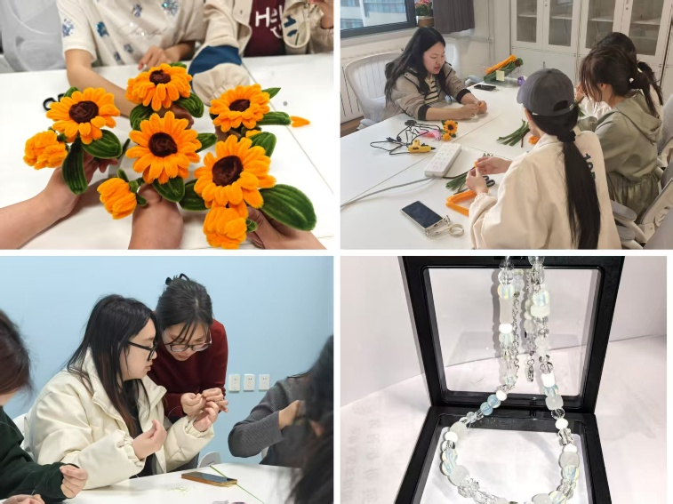 在情感浸润方面,课程搭建起以美育人、以情动人的桥梁。“扭棒成葵”活动中,学生在制作向日葵的过程中深化对“赤诚向阳、积极成长”人生态度的理解;“春日新章”主题创作鼓励学生自由抒怀,通过珠料串联成“春天洗净尘埃”的意象,展现青年一代对美好生活的诠释;母亲节特别活动则让感恩之情融于指尖,同学们在独特设计中传递温暖亲情。
