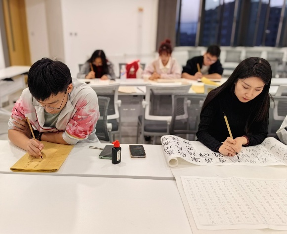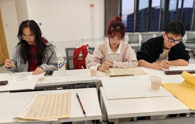 每周二下午6点,国学社成员及书法爱好者们齐聚GXA501教室,共同临摹诗词字帖,在交流互动环节,同学们以书为桥、以字会友。围绕软笔书法的进阶路径、传统书法艺术的守正创新、笔墨艺术与现代生活的融合等话题展开深度探讨,在思想的碰撞中相互启迪,在经验的分享中取长补短。
