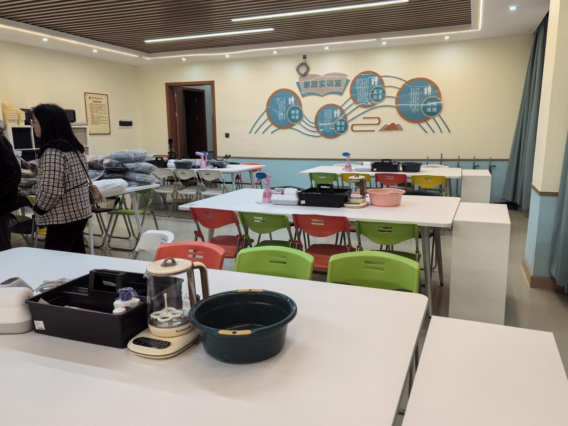 家政整理收纳实训室:跨界融合实训,拓展照护服务维度。核心设备与功能:整理收纳实训资源包:包含衣物分类指南、空间布局案例库、收纳工具使用手册,覆盖衣柜分区、抽屉整理、换季衣物存储等 20 + 实操技巧,助力学员掌握 “断舍离”“标签管理” 等专业方法。家政职业经理人实训资源包:提供收纳流程优化、人员调度、成本核算等管理案例,培养学员在养老机构、居家照护场景中统筹物品管理、协调照护资源的能力。照护延伸:结合养老服务需求,重点培训 “失能老人衣物护理”“卧床用品收纳消毒” 等技能。学员通过智能洗衣机、衣物储藏袋等设备实操,掌握不同材质衣物(如丝绸、棉质)的分类清洗与防皱收纳技巧,实现 “家政服务”与“养老照护”的技能融合,提升居家照护的精细化水平。实训价值:学员在培训中运用健康管理一体机快速采集老人基础体征,结合CGA系统完成“高血压合并认知障碍老人综合评估”,并通过营养配餐系统设计三餐方案。全流程实训强化了“评估 - 干预 - 跟踪”的闭环思维,为大赛中的 “健康照护方案设计” 环节奠定坚实基础。
