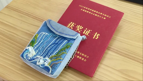 除了传统纹样,她还不断更新设计理念,创作出许多深受人们喜爱的苗绣文创作品。她的作品“黄果树”瀑布图案背包暨苗绣体验材料包在2023年多彩贵州非遗旅游商品定制设计大赛中荣获铜奖,为苗绣这一传统技艺注入了新的活力。