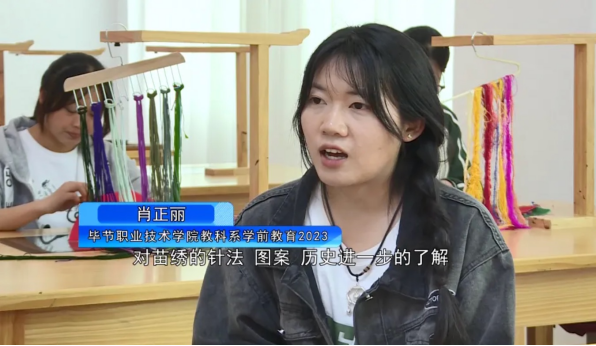毕节职业技术学院教科系艺术课教师吴玲楠:我们贵州苗绣,属于国家级的非物质文化遗产,是中华优秀传统文化的一个部分,我也想作为一个桥梁,让我们的同学来学习苗绣,让他们接触苗绣,喜爱苗绣,从而让我们的苗绣传播出去、传承下来。