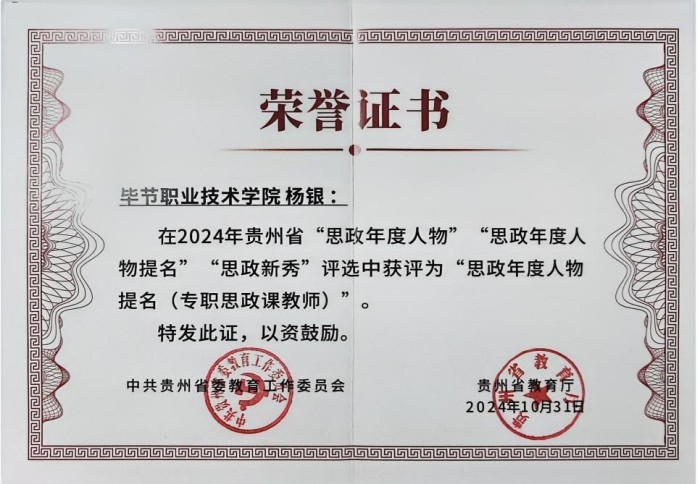 杨银老师积极在更广阔的平台上展示教学成果,提升育人影响力。杨银老师非常珍惜各种展示教学成果的机会。2024年,在教育部大中小学思政课一体化共同体(贵州省)建设工作调度会上,她作为大学学段教师代表进行了教学展示。同年,在贵州省教育厅组织开展的年度评选中,她凭借卓越的综合表现,荣获“思政年度人物提名(专职思政课教师)”这一省级殊荣,并获评“毕节市师德标兵”荣誉称号。这一连串丰硕成果,标志着其教学成果与师德风范获得了从市级到省级层面的广泛赞誉。通过在省级乃至国家级平台上的展示,杨银老师的教学成果得到了广泛认可,让思政育人的成效“丰”硕可见,硕果累累。