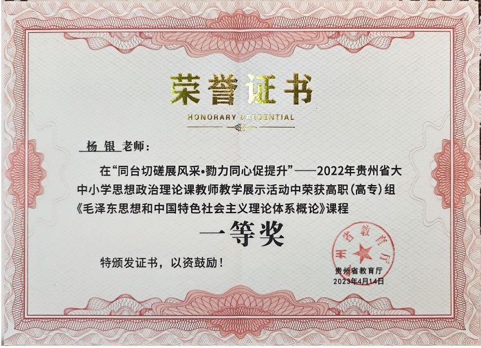为不断检验和提升教学水平,杨银老师主动投身于各类教学能力竞赛的淬炼之中。她以赛促教、以赛促改,成绩斐然:2022年,她荣获毕节市高校思政课教学竞赛一等奖,并在贵州省大中小学思想政治理论课教师教学展示活动中斩获高职(高专)组一等奖;2023年她更上一层楼,在全国高职高专院校思想政治理论课微课教学比赛中获得二等奖。在2015年贵州省职业院校技能大赛教学能力比赛高职思政课程组比赛中,她与团队成员获得三等奖。此外,她指导学生参加第八届贵州省“互联网+”大学生创新创业大赛荣获铜奖,指导学生在2024年薪火黔行--“辉映红飘带·传承长征魂”红色文创设计大赛中荣获二等奖,被评为优秀指导老师。因其深厚的教学功底和突出贡献,2023年,杨银老师被聘为毕节市大中小学思政课一体化建设专家。一系列高水平的奖项,正是杨银老师通过以赛促教,让自身教学能力“强”起来的最佳证明。