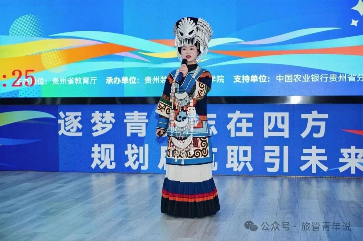 韦媛同学身着民族特色服饰,将民族文化与旅游服务相结合,在现场展示中传递出的职业理念,赢得了评委与观众的认可。