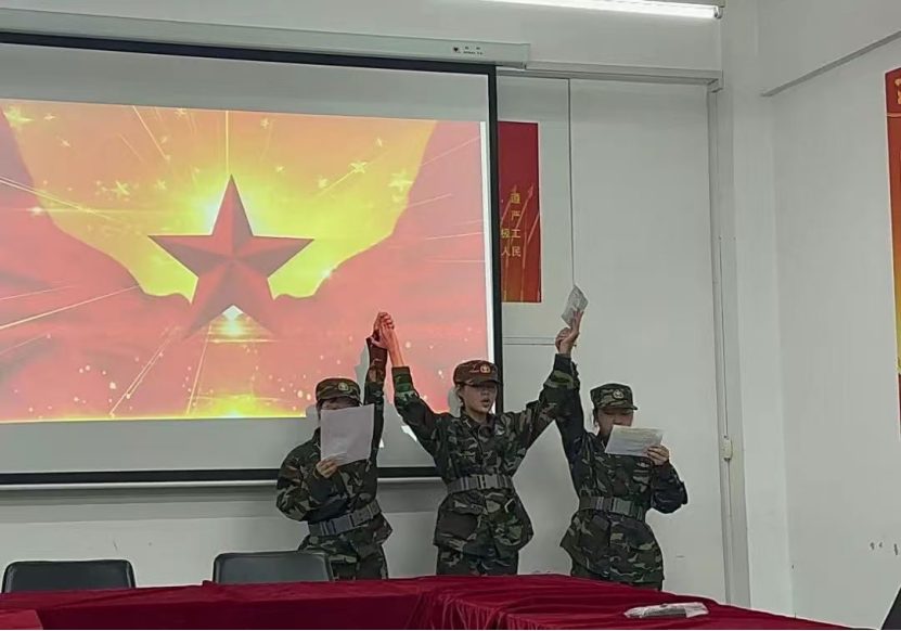 其中,身着迷彩服的同学组合尤为引人注目。他们站在投影幕布前,幕布上,那颗鲜红的五角星在红黄交织的背景中熠熠生辉,仿佛是革命精神的璀璨象征。三人中,中间的同学身姿挺拔,双手高举,脸上洋溢着饱满的激情与自豪。左右两侧的同学手持文稿,目光专注,声音铿锵有力地讲述着。他们讲述的是抗日战争时期,一群年轻战士在艰苦卓绝的环境下,为了守护家园、保卫祖国,毅然奔赴战场的故事。从战士们如何在缺衣少食的困境中坚守阵地,到他们与敌人展开殊死搏斗的激烈场景,再到那些为了胜利而默默奉献甚至牺牲生命的动人细节,都被他们生动地演绎出来。现场的同学们仿佛被带入了那个烽火连天的岁月,看到了战士们冲锋的身影,听到了战场上的枪炮轰鸣与呐喊助威。
