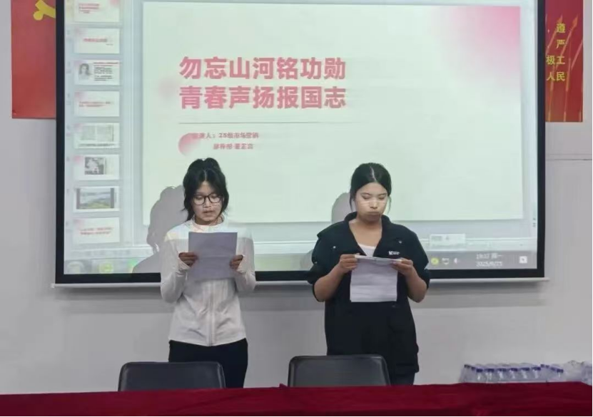 还有两位同学,她们站在写有 “勿忘山河铭功勋,青春声扬报国志” 的投影前,讲述的是一位抗日女英雄的事迹,从女英雄年少时的爱国启蒙,到投身抗日工作后的机智与勇敢,再到最终为了民族解放事业献出宝贵生命的悲壮结局,娓娓道来,情感真挚。现场不少同学都被这故事打动,眼神中流露出对英雄的崇敬与缅怀。