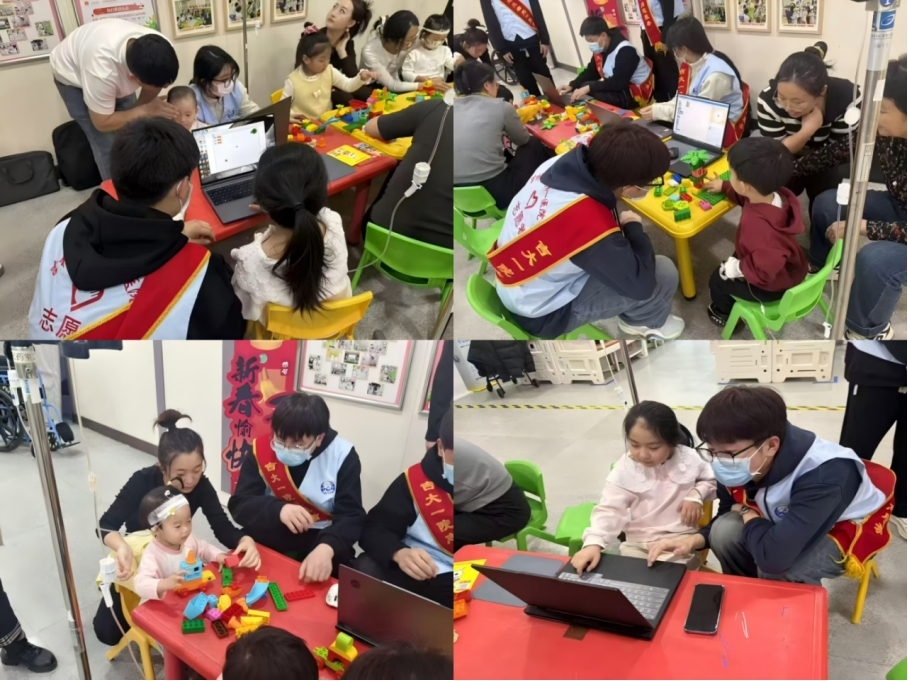 聚焦住院儿童这一特殊群体,服务队发起“E童计划”儿童关怀志愿服务活动,将温暖与计算机专业知识带进吉林大学白求恩第一医院的病房。志愿者们化身温柔的“大朋友”与趣味的“引路人”,针对患儿治疗中的紧张与孤独,打造“心灵陪伴+趣味互动”的服务模式。他们将枯燥的代码逻辑转化为色彩斑斓的互动游戏,把抽象的编程思维融入轻松的拼图故事,用通俗易懂的方式为孩子们打开数字世界的大门。这场暖心服务,不仅缓解了患儿的就医焦虑,更在孩子们心中种下了探索科学的种子,以专业所长回应社会所需,让无私关爱化作触手可及的温暖,照亮困境中的童心。