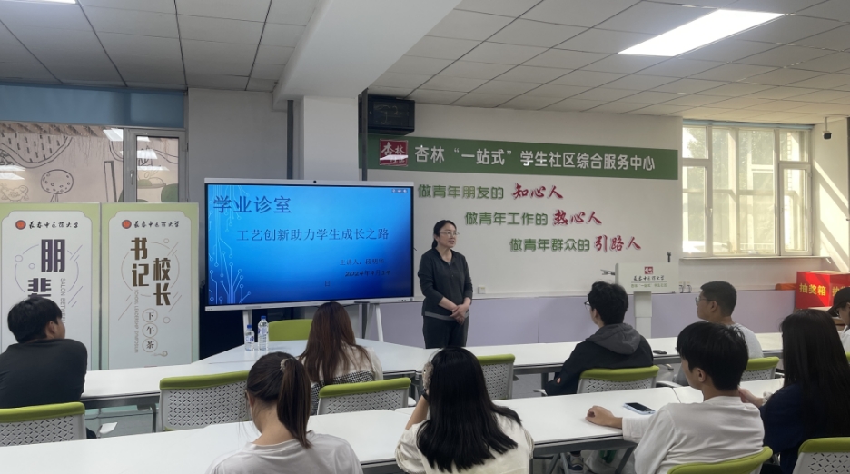 为让同学们认识工艺创新的重要性,及其对未来成长之路的影响,药学院于2024年9月19日12:30在杏林“一站式”学生服务大厅开展“学业诊室”活动。段明华老师受邀为同学们进行“工艺创新助力学生成长之路”主题分享。