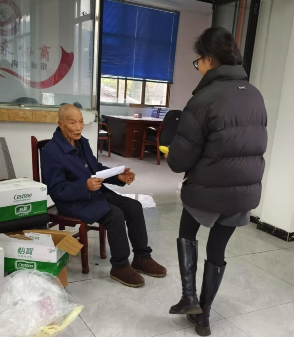 在社会实践期间,我主要协助村干部完成一些日常简单工作。例如,帮助收集村民填写的各种表格、准备好召开村民代表大会的会议室、分发困难户春节慰问物资等。通过这些看似平淡的工作,不仅提升了我服务基层的能力和水平,同时也对四景村的现状及发展规划有了更清晰的认识。我们跟随村干部们入户走访摸情况,亲身感受基层干部日常工作的不易。“大孃,你家种植的菌子长得好哦“,”“幺叔,吃晌午饭没?” 每一句温暖的问候,都饱含着村干部对村民生产生活的关切,仿佛这里的每一位村民都是他们血脉相连的至亲。他们仔细查看村里特色种植业的发展状况以及种植的农作物的生长状况,认真询问村民是否收到政府补贴。在泥泞的山路上,黄泥巴沾满了鞋子,大家每走一步都容易打滑,甚至还会摔倒,对于我们这些初来乍到的志愿者来说,着实让人难以忍受。而这些,早已成为村干部们日常工作的一部分。