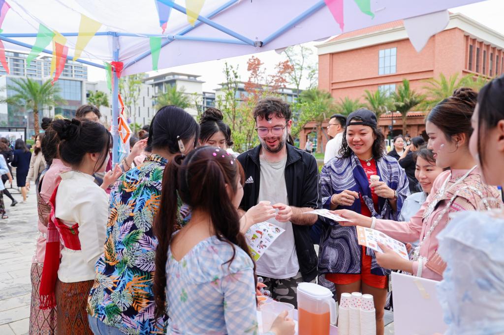 开幕式后,中外青年学子在音乐声中,拿着各式各样的容器,接受现场友人的泼水祝福。水珠在阳光下化作虹霓,落在脸颊、肩头,浸润心田。