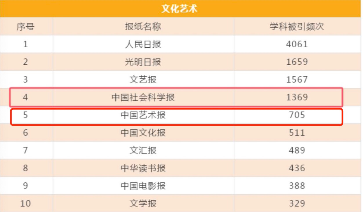 《中国艺术报》是由中国文学艺 术界联合会主管主办的国家级文艺行业大报,2024年,《高学术影响力中国报纸评价报告》首次发布,《中国艺术报》位列其中,在文化艺术类别中仅次于《人民日报》《光明日报》《文艺报》和《中国社会科学报》,学科被引频次排名第五。