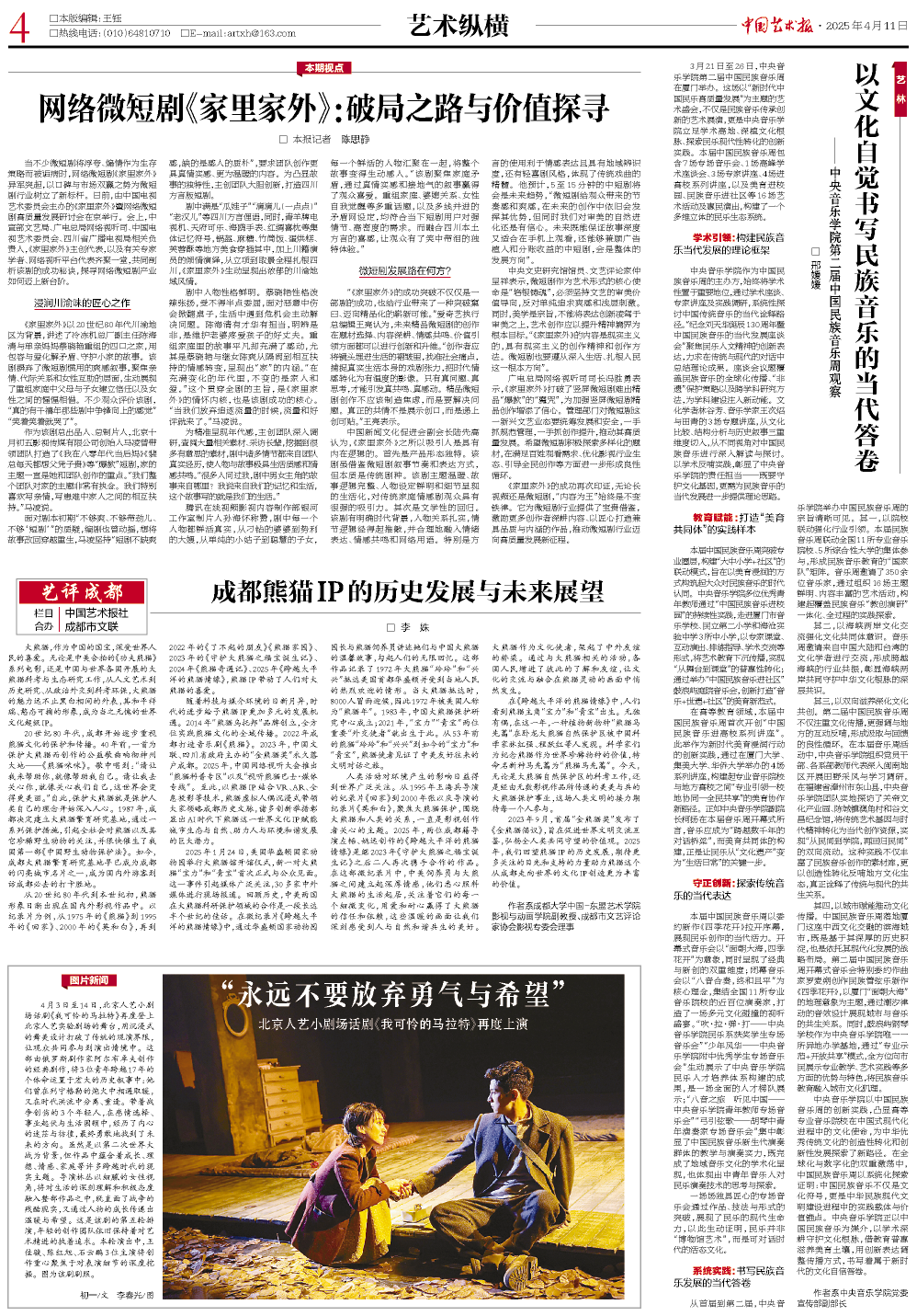 4月11日,我院新媒体艺术传播研究生方向负责人、影视艺术系李姝副教授所撰写的《成都熊猫IP的历史发展与未来展望》发表于《中国艺术报》(理论版)2025年4月11日第4版。全文已被成都市文学艺术联合会官方公众号“蓉城文艺”全文转载。