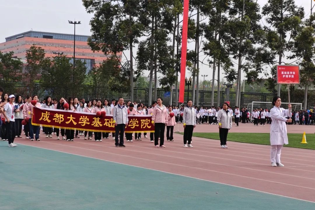 伴随着激昂的《运动员进行曲》响起,本次田径运动会开幕式拉开帷幕。在一声声铿锵有力的“人道关怀,生命第一;人文关怀,科学第一”的院训中,基础医学院师生迈着整齐矫健的步伐,昂首挺胸,走向主席台。