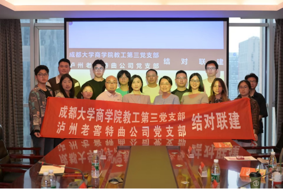 近日,商学院党委书记李行带领教工第三党支部教师党员及学生党员代表赴泸州老窖特曲销售股份有限公司开展支部结对联建活动。泸州老窖特曲销售股份有限公司党支部副书记、工会主席、人力资源部经理赵常宇和泸州老窖特曲销售股份有限公司成都片区经理刘云鹏出席结对联建仪式。