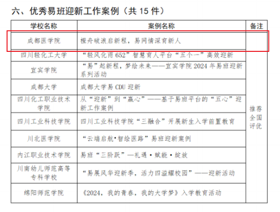 近日,四川省教育厅易班建设与发展中心发布《关于公布2024年度四川易班共建高校优秀工作案例遴选及展示评优结果的通知》。我校荣获“优秀易班共建高校”“优秀易班工作站站长”“优秀易班迎新工作案例”三项奖项,其中“优秀易班迎新工作案例”“优秀易班工作站站长”拟被推荐参加全国评优。