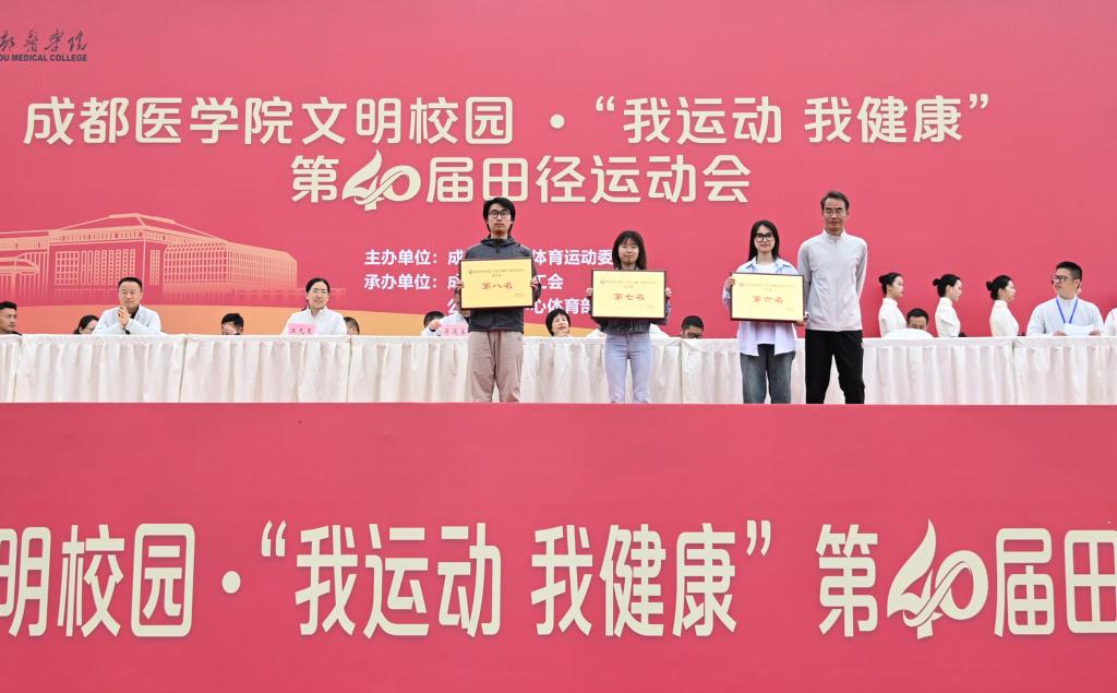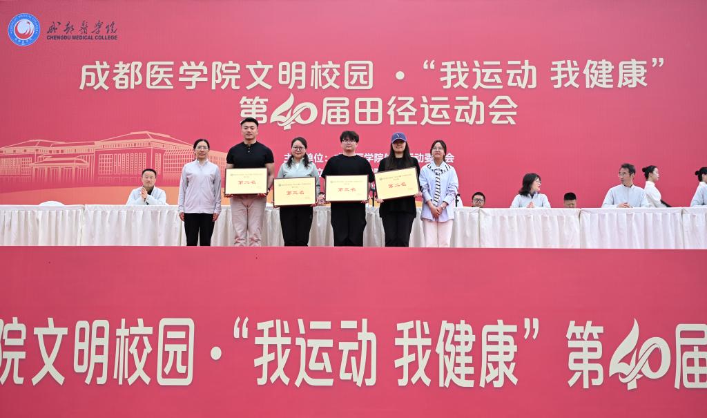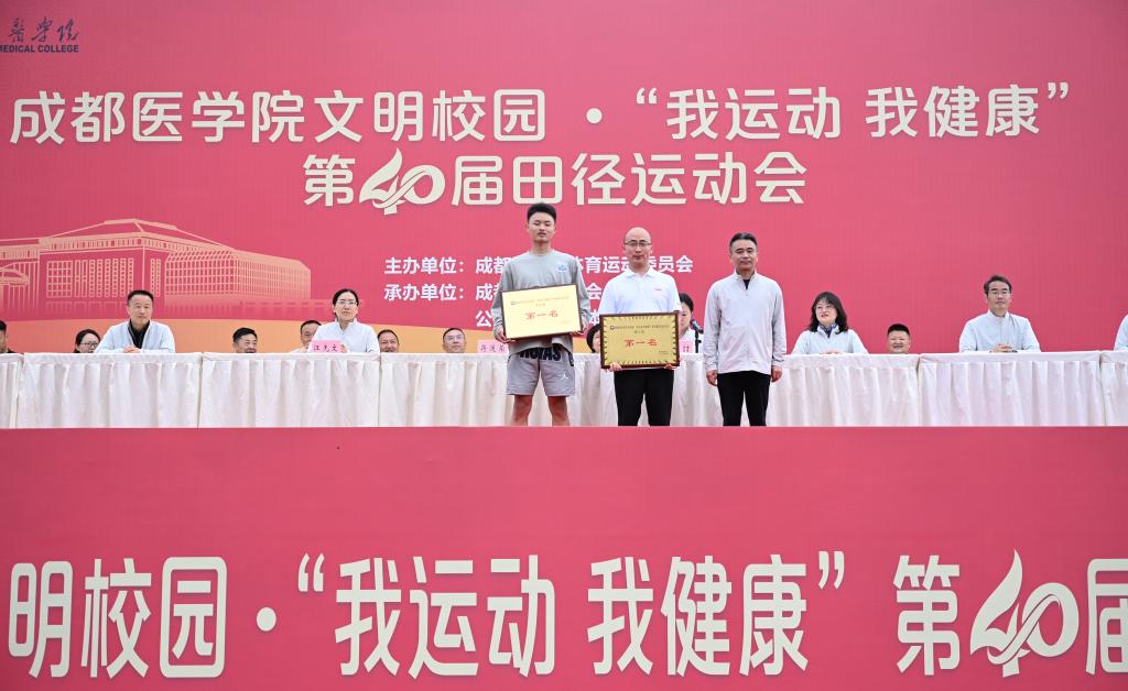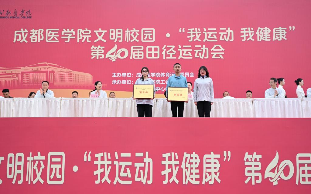 4月26日下午,成都医学院第40届田径运动会各项赛事全部结束,圆满闭幕。两天比赛中,成医师生全情参与,以昂扬姿态奋勇争先,在速度与力量的较量、技巧与协作的比拼中,诠释着“我运动 我健康”的理念,展竞技之美,书青春华章。闭幕式上,校党委副书记蒋通荣致辞,获得教职工团体1-3名、学生团体1-8名的代表上台领奖。