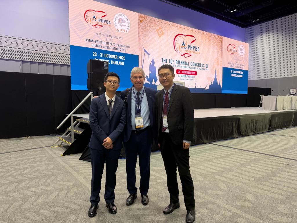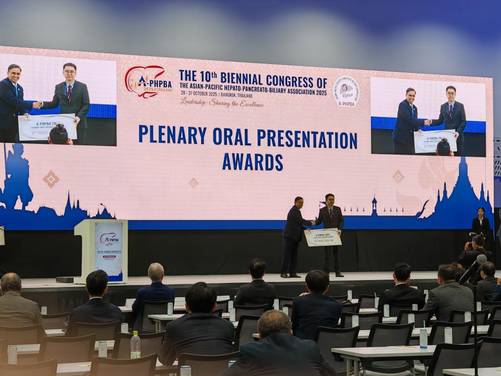 团队代表、临床医学院2023级在读硕士研究生卢唯医师在大会上作了全英文口头汇报,并就与会专家的提问进行了专业解答,充分展现了成医青年学者的风采。在闭幕式颁奖典礼上,亚太肝胆胰协会(A-PHPBA)主席Shailesh V.Shrikhande教授为团队代表颁奖。国际肝胆胰协会(IHPBA)主席René Adam教授也对本研究的思路与成果给予了高度评价。
