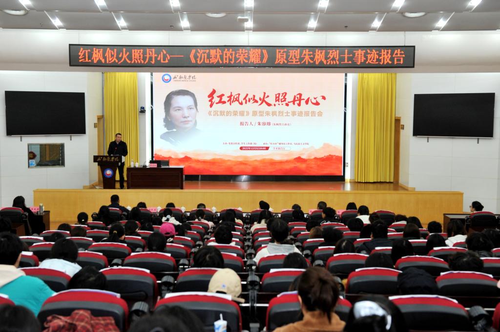 据悉,本次“红枫似火照丹心:《沉默的荣耀》原型朱枫烈士事迹专题报告会”暨红医文化讲堂(第九讲)由学校党委宣传部、学生工作部(处)联合主办,“红小医”辅导员工作室、马克思主义学院共同承办。活动旨在引导广大师生传承红色基因、体悟红医精神,进一步增强历史自觉、坚定文化自信、筑牢精神根基。