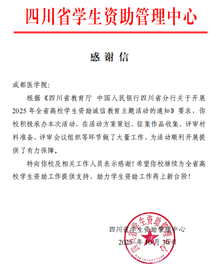 此前,四川省学生资助管理中心专门向学校发来感谢信,对成都医学院成功承办“2025年全省高校学生资助诚信教育主题活动”表示高度认可,赞扬学校在活动策划、组织协调与后勤保障方面的出色工作。
