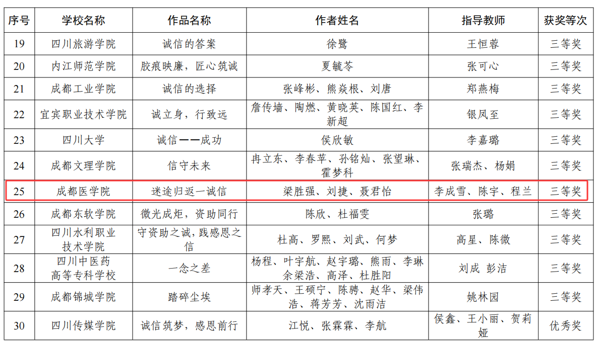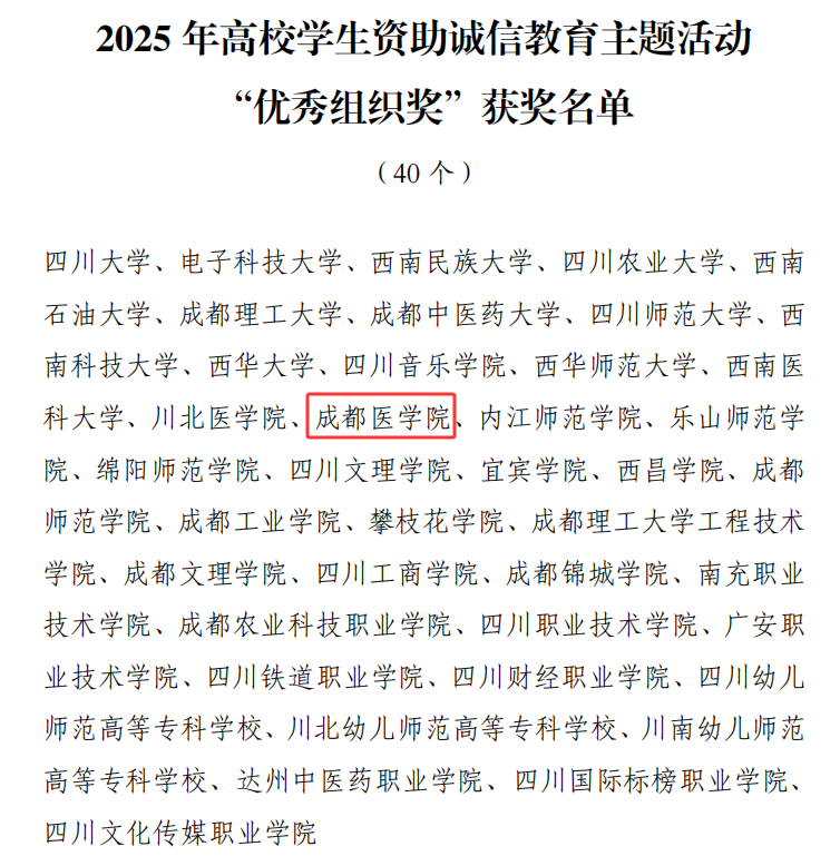 此外,在2025年全省高校学生资助诚信教育宣传作品评选活动中,成都医学院获二等奖1项,三等奖2项,优秀奖2项,并再次获评优秀组织奖。