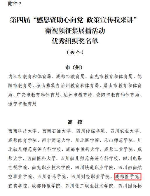 在第四届“感恩资助心向党 政策宣传我来讲”微视频征集展播活动中,成都医学院两部作品荣获优秀奖,学校获优秀组织奖。